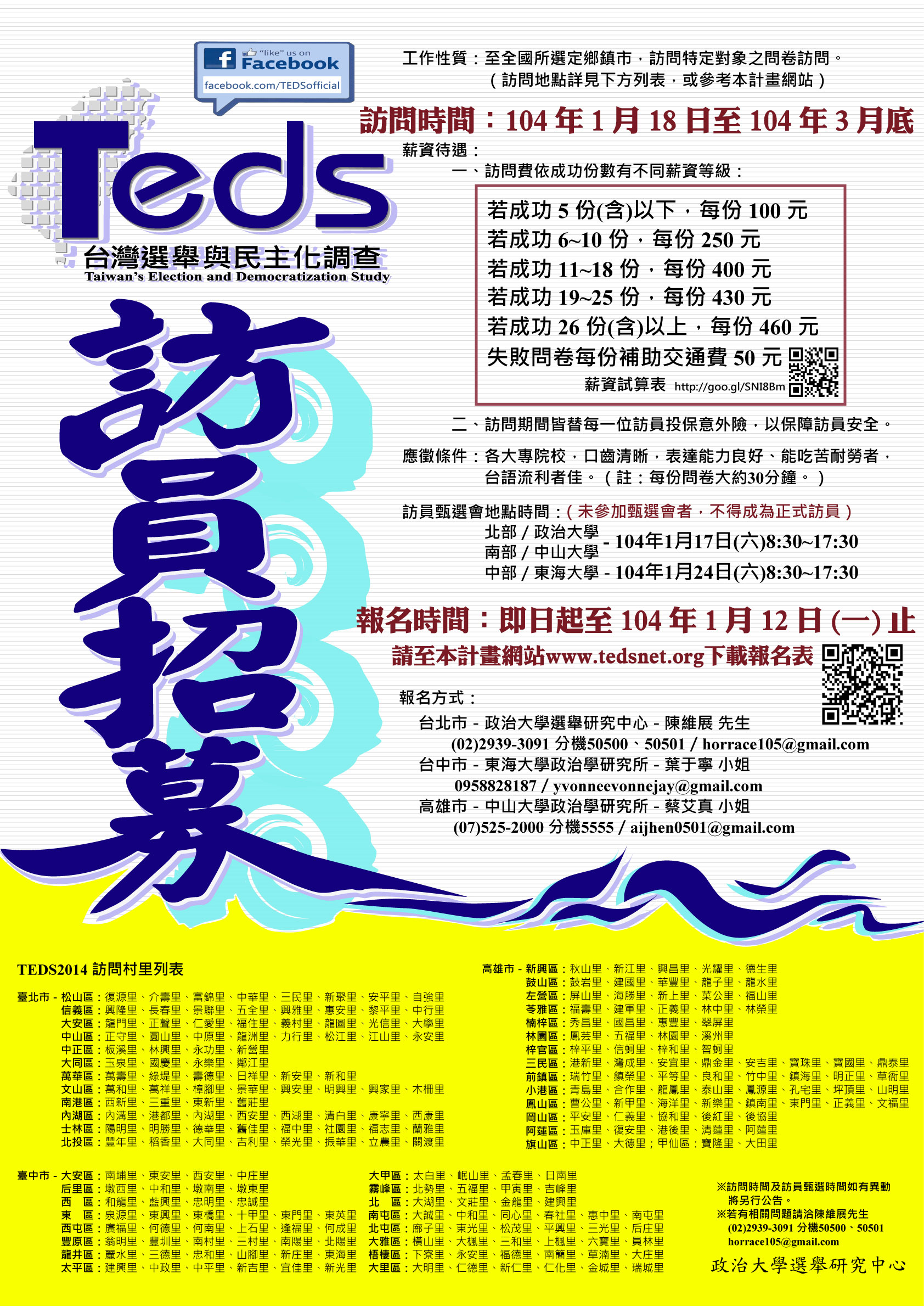 「台灣選舉與民主化調查」誠徵「2014年九合一選舉面訪(TEDS2014)」面訪訪員。
